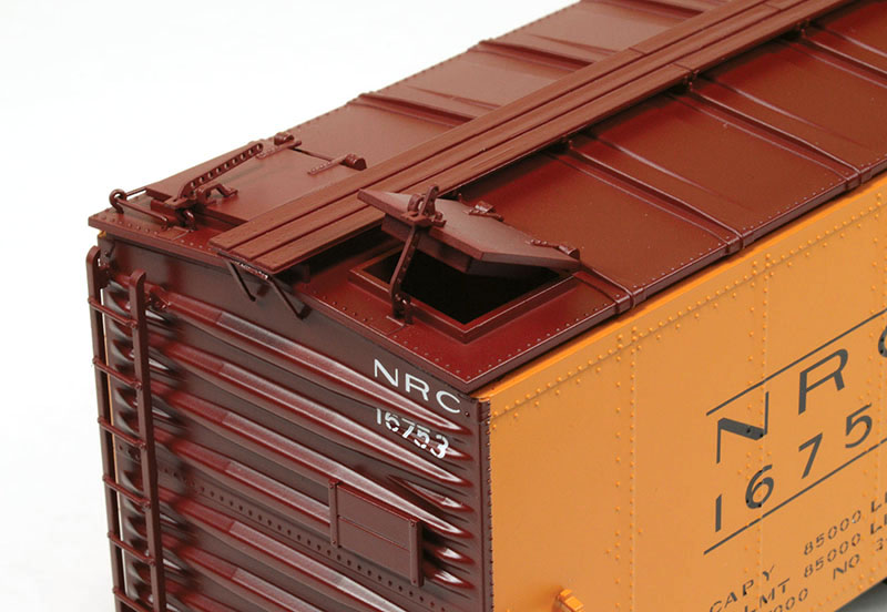 The model’s ladders, grab irons, end brake rigging, and placards all appear to be separate details. Examining the brake wheel and checking it against those presented in Pat Wilder’s “Freight Car Hand Brakes – 1920s to 1950s” article that appeared in Railway Prototype Cyclopedia 10, I’d say the model has an Ajax-style example. The accurate wood-style plank running board appearing on the center of the roof is separate and includes finely scaled posts positioned near the roofline on the car ends supporting the running board.